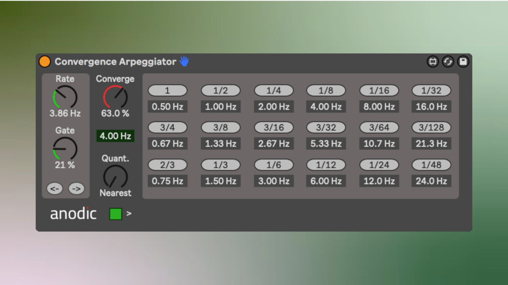 Most arpeggiators can sequence over a free rate (Hz) or a clock synced rate, but offer little play in between the two. The Convergence Arpeggiator is a Max MIDI device that can fluidly move its sequence from free rate to clock synced and back with the turn of a knob.